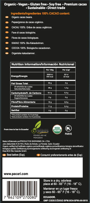 Enjoy delicious, award-winning organic, vegan, and fair-trade raw (unroasted) chocolate made with 100% cacao. This product is palm-oil free, gluten-free, dairy-free, soy-free, GMO-free, nut-free, sugar-free, and Kosher-certified. Get the best quality cacao with no added sugars. Our minimally processed raw chocolate is full of the complex flavour of the natural cacao bean.