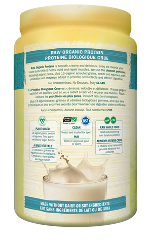 Raw Organic Protein is a Certified Organic, Non-GMO Project Verified raw vegan protein powder made with 13 raw sprouted proteins delivering 22g of protein with a complete profile of all the essential amino acids along with added fat-soluble vitamins, probiotics and enzymes. It is the highest quality alternative to soy, whey and milk protein, making it a great protein for those with sensitivities to milk and other proteins.
