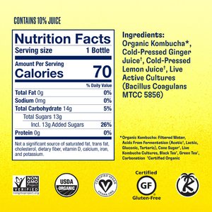 Organic Kombucha [Filtered Water, Kombucha Culture (Yeast and Bacteria Cultures), Organic Black Tea, Organic Green Tea, Organic Cane Sugar, Carbonation] Cold Pressed Organic Ginger Juice, Cold-Pressed Organic Lemon Juice