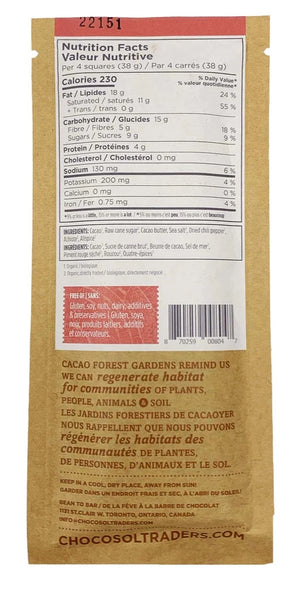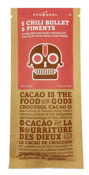 Ingredients: Roasted cacao nibs, raw cane sugar, cacao butter, sea salt, five chili blend, allspice.