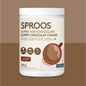 Sproos® Super Hot Chocolate is a perfect blend of organic raw cacao, wild-caught marine collagen, MCT powder and 4 functional mushrooms. Simply add one scoop to your favourite heated milk for a delicious and health-packed hot chocolate.