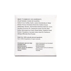 Sodium Coco Sulfate*, Kaolin*, Ledum Groenlandicum Extract*, Sodium Cocoyl Isethionate*, Prunus Armeniaca (Apricot) Kernel Oil*, Glycerin*, Simmondsia Chinensis (Jojoba) Seed Oil*, Cocos Nucifera (Coconut) Oil*, Theobroma Cacao (Cocoa) Seed Butter*, Butyrospermum Parkii (Shea) Butter*, Citrus Grandis (Grapefruit) Seed Extract*, Tocopherol*, Cannabis Sativa (Hemp) Seed Oil*, Panthenol, Althaea Officinalis Root Powder*.