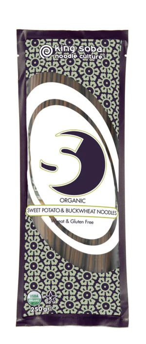 King Soba's Organic Sweet Potato & Buckwheat Noodles are the perfect, all-natural way to enjoy noodles while staying healthy. Each 3-serving pack is 100% organic, Gluten & Wheat Free, vegan, Non-GMO and contains 8.8oz of buckwheat and sweet potato. Buckwheat is naturally high in minerals such as magnesium that help lower cholesterol, while sweet potatoes are packed with vitamins like A, C and E and are low-fat. Enjoy this delicious, nutritious meal today!