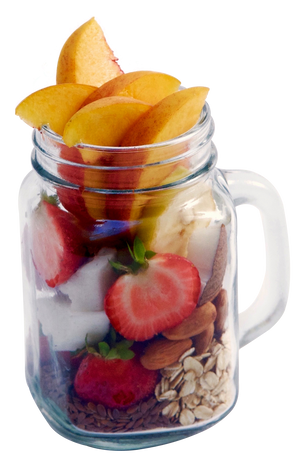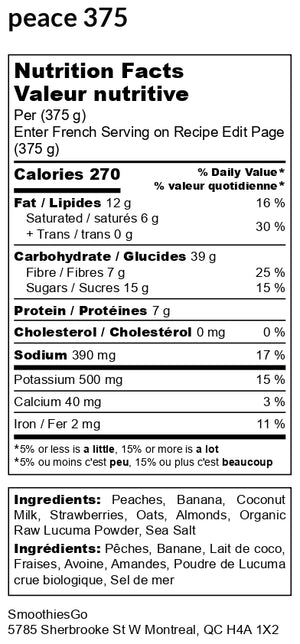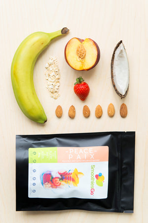 Ingredients: Peaches, Bananas, Strawberries, Organic Gluten-Free Oats, Organic Coconut Milk, Almonds, Organic Flax Seeds, Organic Lucuma, Himalayan Salt.