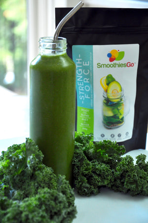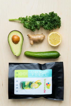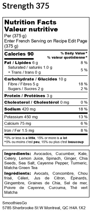 This rich and creamy energizing green smoothie is easy to digest, great for your skin, and perfect during your workout or at any time of the day! Naturally hydrating cucumber is an anti-inflammatory and is great for your digestion. Nutrient-dense kale gives you vitamins, calcium, and iron. And omega-3-rich avocadoes give this smoothie a delicious creaminess. Add to that iron-rich spinach, protein-dense chia seeds, antioxidant-laden matcha green tea, vitamin-rich lemons, and immunity-boosting ginger, and you have the perfect blend to keep you going strong! Our smoothies are all made so they'll taste great mixed with just water, but you can use 1 cup of any liquid you like.