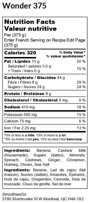 Ingredients: Bananas, Homemade Cashew Milk (Water, Cashews, Organic Vanilla Extract), Spinach, Almonds, Dates, Organic Ginger, Organic Cinnamon, Nutmeg, Cloves, Himalayan Salt.